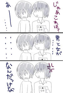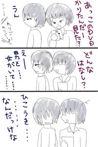 一刻「どんな映画にも男と女は出てくるだろーがよ!!」 永真は読書、映画鑑賞が趣味ですが ただの暇つぶしでやってるので、内容をほとんど覚えていません。 ネタがないと東和兄弟をかきたくなる。 できるだけバランスよく全キャラ描くようにしたいんですけど。 ちなみにウィリアムを描かないのは迷彩服描くのが面倒だからです。