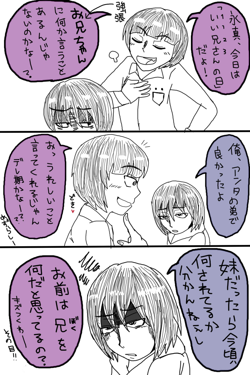 此方のブログは今後、ツイッターで上げた絵を展示しなおすログ置場になります。 ので、更新速度が下がると思いますが 今までの絵は消さないで残しておきます。思い出に。 永真が風邪で学校を休んだ日、一刻がウィッグ着用で永真のふりをして学校に行き 後日バレて怒られる というネタ。 何気に希成が一番ひどい事言ってる。 良い兄さんの日の東和兄弟。 妹だったら着替え覗くとか平気でしてると思う。 かきやすいキャラを描いていると必然的に東和兄弟ばかりになる。