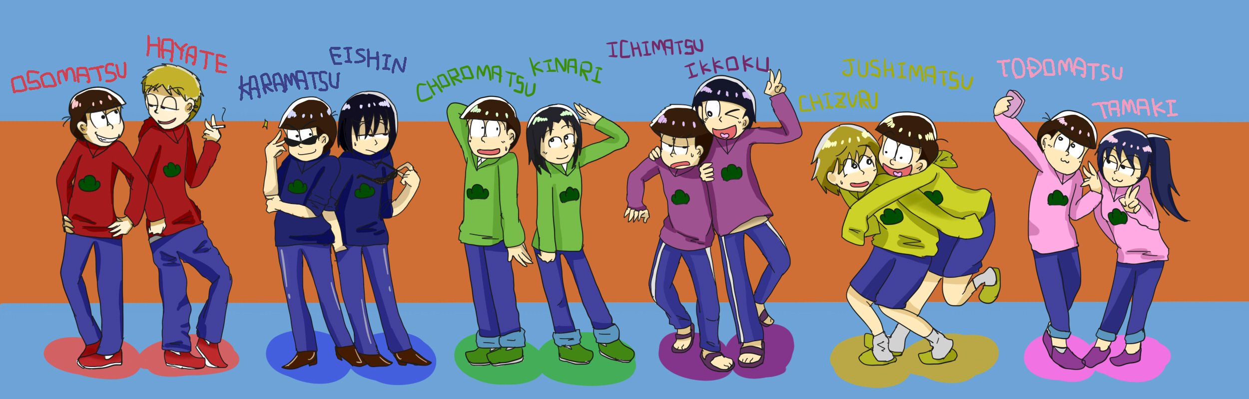 おそまつさーん! …某アニメにドはまりしたので、現代っこたちとコラボしてみました 絵柄もちょっと似せてみたよ。 それぞれのテーマカラーのキャラ同士をくっつけたら(環は水色なのですが、いないのでピンクに) 性格が合ってるのと正反対のと居て、楽しかったです。 そして環がママさんにしか見えない…