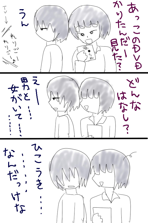 一刻「どんな映画にも男と女は出てくるだろーがよ!!」 永真は読書、映画鑑賞が趣味ですが ただの暇つぶしでやってるので、内容をほとんど覚えていません。 ネタがないと東和兄弟をかきたくなる。 できるだけバランスよく全キャラ描くようにしたいんですけど。 ちなみにウィリアムを描かないのは迷彩服描くのが面倒だからです。