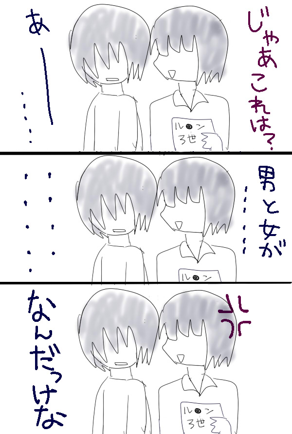 いってきます。 あー2日もパソコンから離れるのか~。(ネット依存症) …とかは考えないようにして、日常から離れて暫し休息してきますね。 こいつら旅先でも確実に喧嘩する。 学生の旅行なら、もっと大人数でいって、夜にトランプとかウノで盛り上がるのが定石でしょう。 なので千鶴と希成も描きたかったけど、力尽きました。
