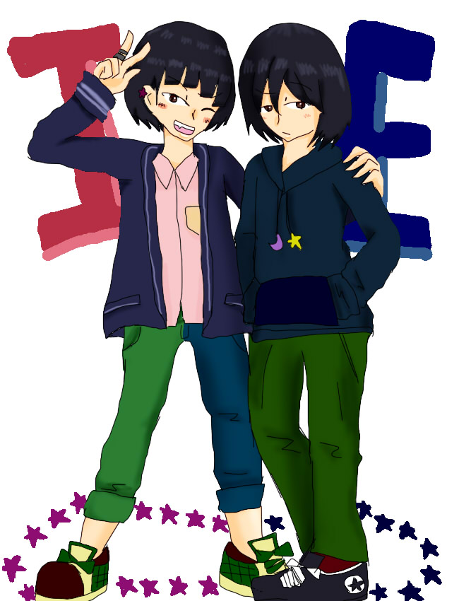 たまには仲良くしたらえぇじゃないか 東和兄弟は並べると絵になるんですよねー描きやすいし。 相変わらず服装センスがドイヒーですが 一刻はモッズ系からエスニック系まで色んな服を着そうだし(あとアクセサリーじゃらじゃら) 永真はユ●クロと無●良品と一刻の着なくなった服をヘビロテしそうだなぁと思います。